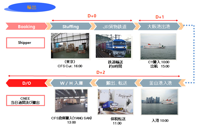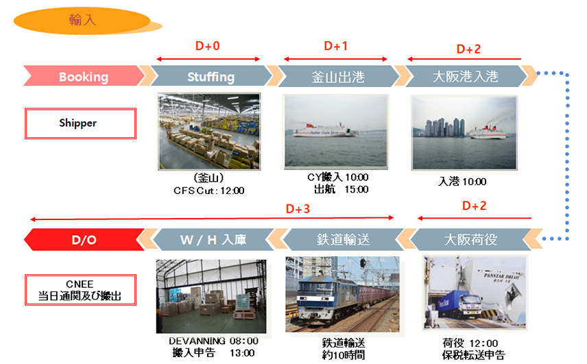 パンスターは釜山と日本間を運航するフェリーと正確な定時スケジュールで有名なJR貨物鉄道を連携し、日本全域をつなぐ物流ルートを構築しました。